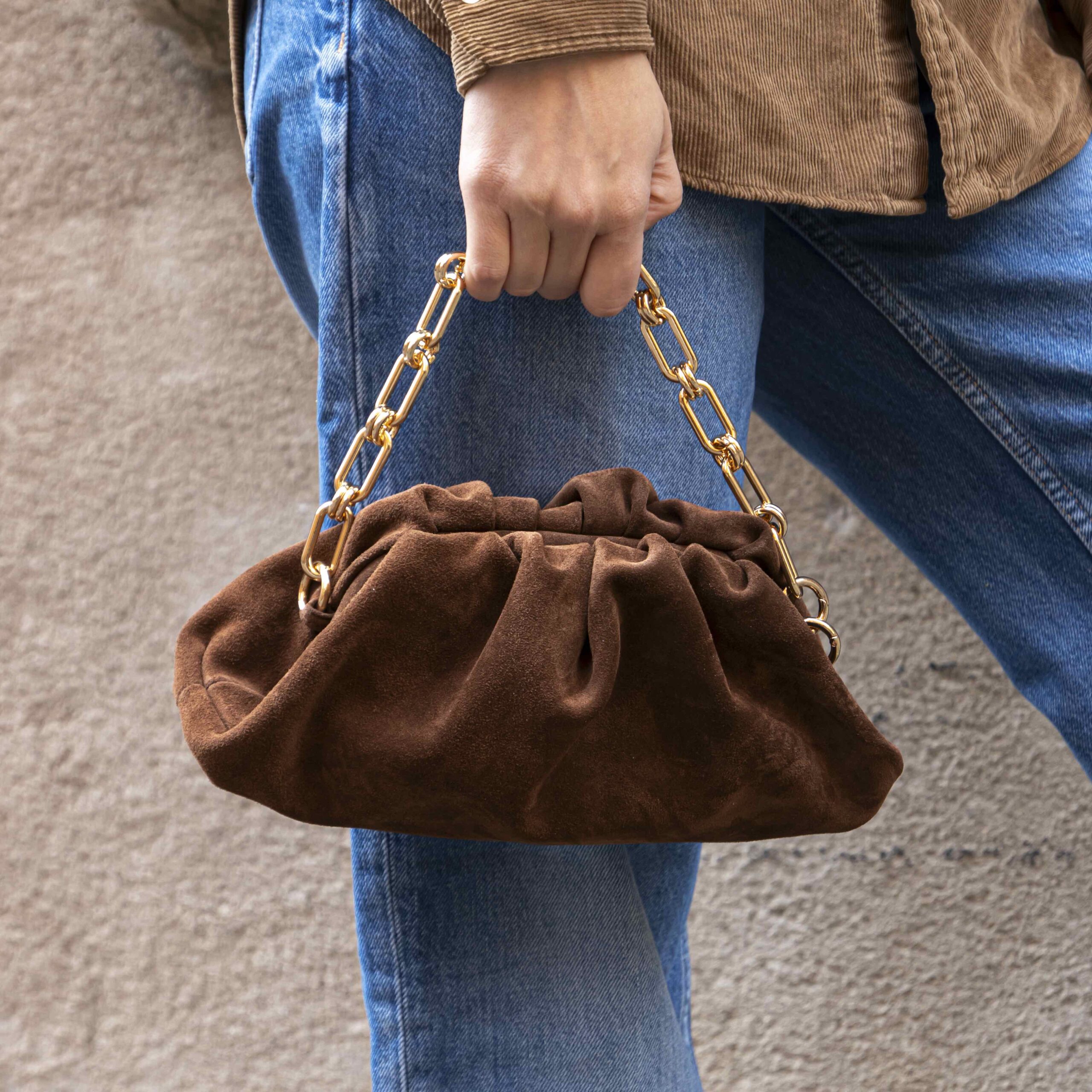 Borsa clutch con catena in camoscio marrone