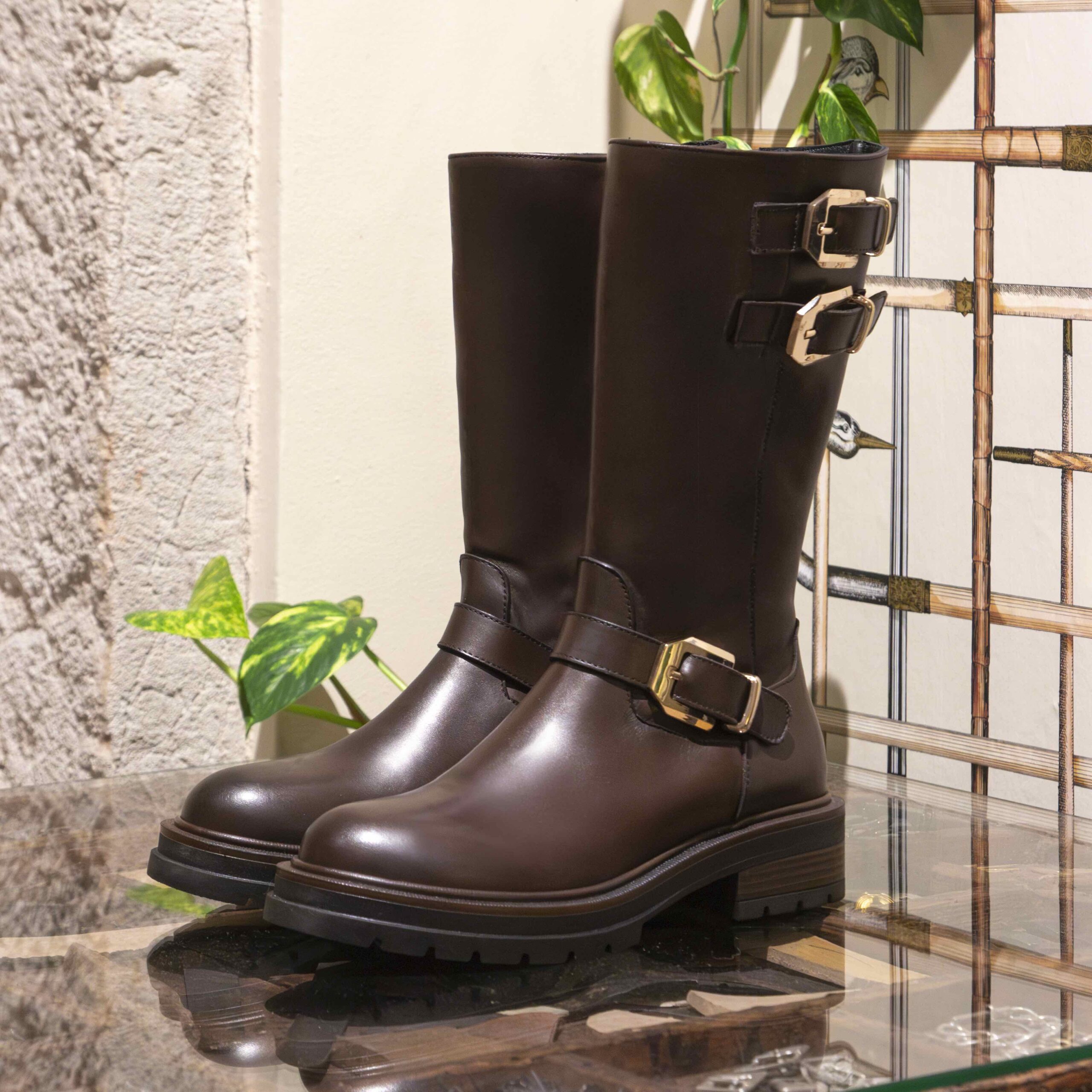 Stivale al polpaccio testa moro con fibbie